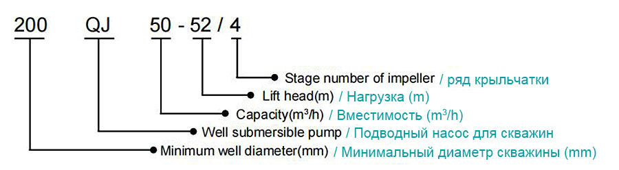 Model Minimal quduq diametri (mm) QJ (oqim tezligi (m3/soat) - oqim bosimi (m)/pervanel darajasi |