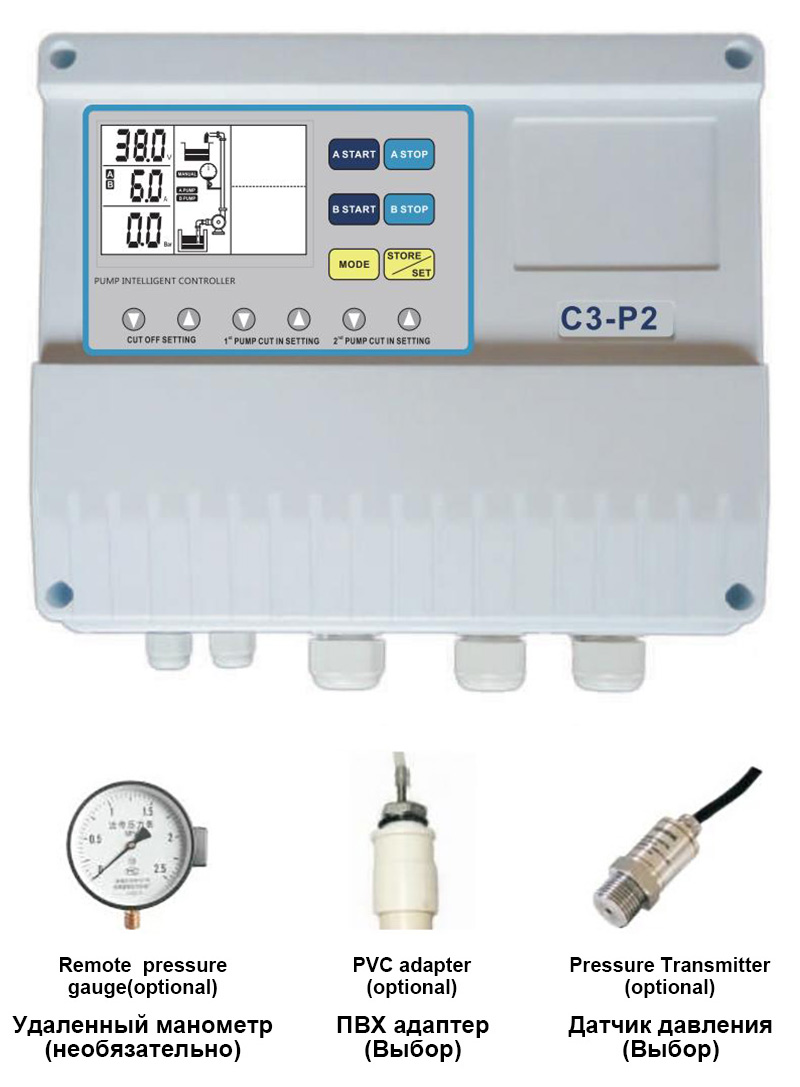 ZEN Machinery yuqori sifatli C-P2 Boost Duplex Pump Controller quyidagi boshqaruv funktsiyalari bilan jihozlangan: impuls elektrod probi / float kaliti / elektr kontakti; bosim o'lchagich / bosim rölesi; displey ingliz tilidagi dinamik LCD displey; qo'lda / avtomatik boshqarish rejimi va qo'lda va avtomatik rejimlarda to'liq himoya funktsiyalari.