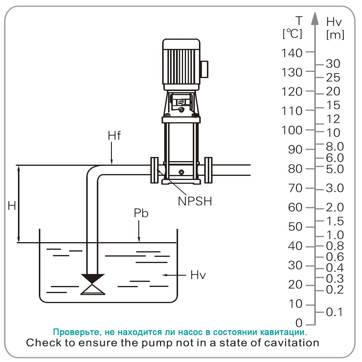 Nasosdagi bosim pompalanadigan suyuqlikning bug'lanish bosimidan past bo'lsa, kavitatsiya paydo bo'lishi mumkin. Kavitatsiyani oldini olish uchun nasosning assimilyatsiya tomoni minimal bosim ostida saqlanishiga ishonch hosil qiling. H [m] ning maksimal qiymatini quyidagi formula yordamida hisoblash mumkin.