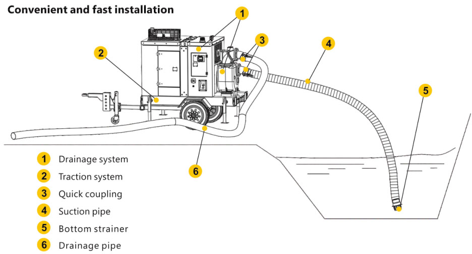 ZEN Machinery yuqori sifatli PV tipidagi treyler dizel dvigatel pompasi elektrsiz dala drenajiga mos keladi; o'rnatilgan vakuum kuchaytirgich tizimi, nasos korpusini suv bilan to'ldirishga hojat yo'q. Ishga tushgandan keyin tezda drenajlashni boshlashi mumkin; yo'l tirkamasi uchun tizim, tezlik: 40 - 80 km / soat; shassisga o'rnatilgan yonilg'i baki, 8-10 soat davomida ishlashi mumkin.