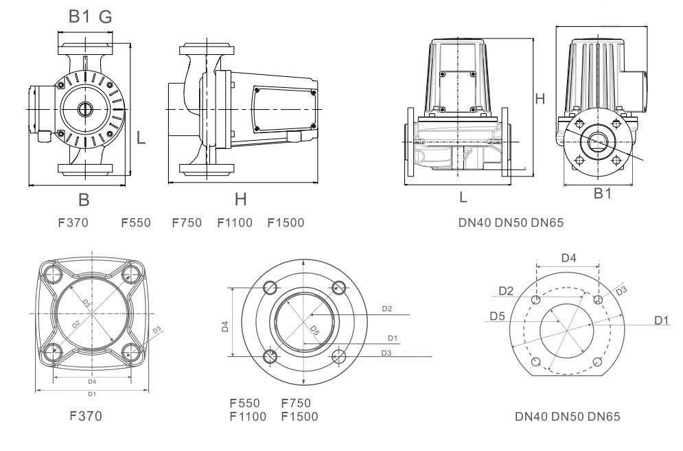 | (V) | (m³/soat) | (m) | 220V/50Hz | 220V/60Hz | 380V/50Hz | L | B | B1 | H | G | D1 | D2 | D3 | D4 | D5 | ||