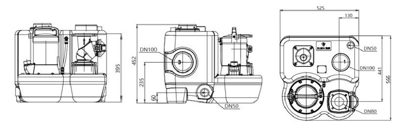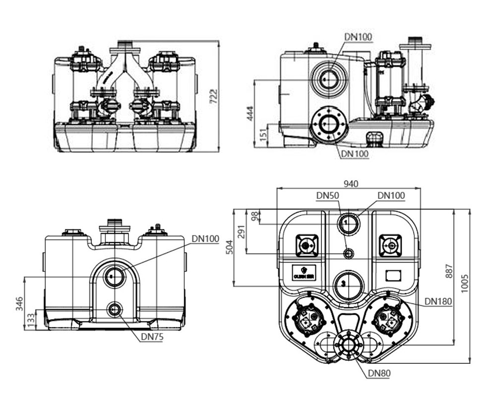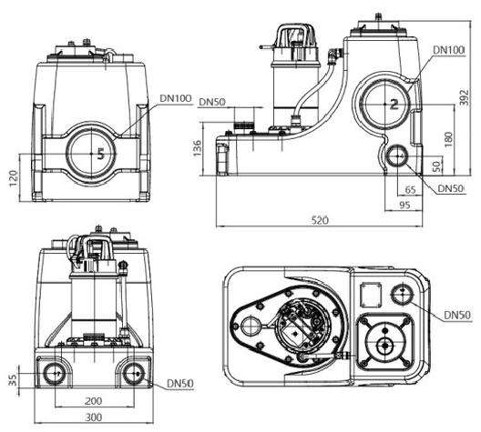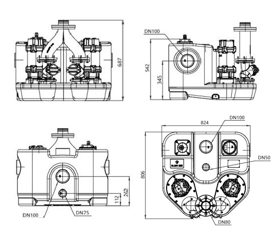 WL 40L-500L kanalizatsiya nasosini ko'tarish stantsiyasida uchta DN100 suv kirish teshiklari, to'rtta DN50 suv kirish yoki texnik xizmat ko'rsatish teshiklari va bitta DN50 chiqishi mavjud.