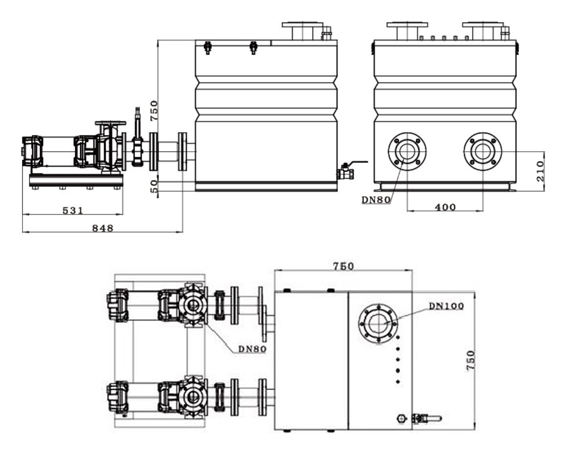 WL - 500L uchta DN100 kirish va bitta DN80 chiqish joyiga ega. Yuqori qismi DN50 egzoz porti bilan jihozlangan. Suv sathi er-xotin suzuvchi datchiklar yordamida nazorat qilinadi. Xitoyning LED displeyli devorga osilgan boshqaruv qutisini sozlash motorni himoya qilish va nosozliklar haqida ogohlantirish kabi ko'proq funktsiyalarni amalga oshirishi mumkin. Xuddi shu suv idishini ulash orqali katta hajmga erishish mumkin.