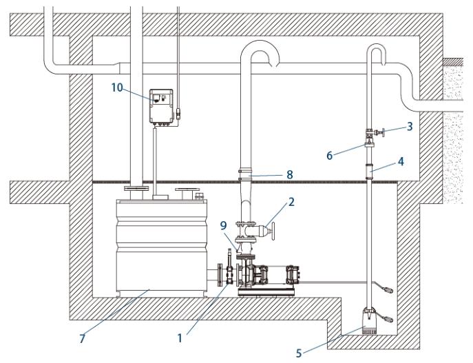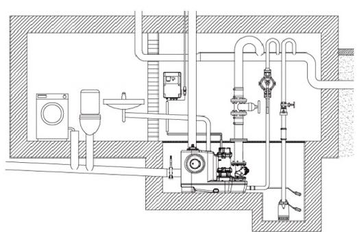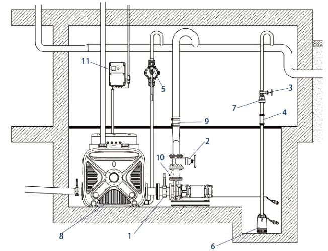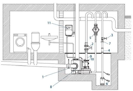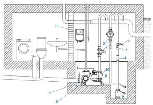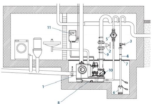| 7 - Tekshirish valfi | 8 - kanalizatsiya ko'tarish moslamasi | 9 - amortizator shlangi |
