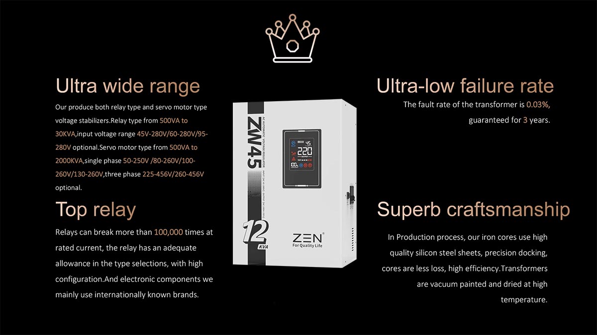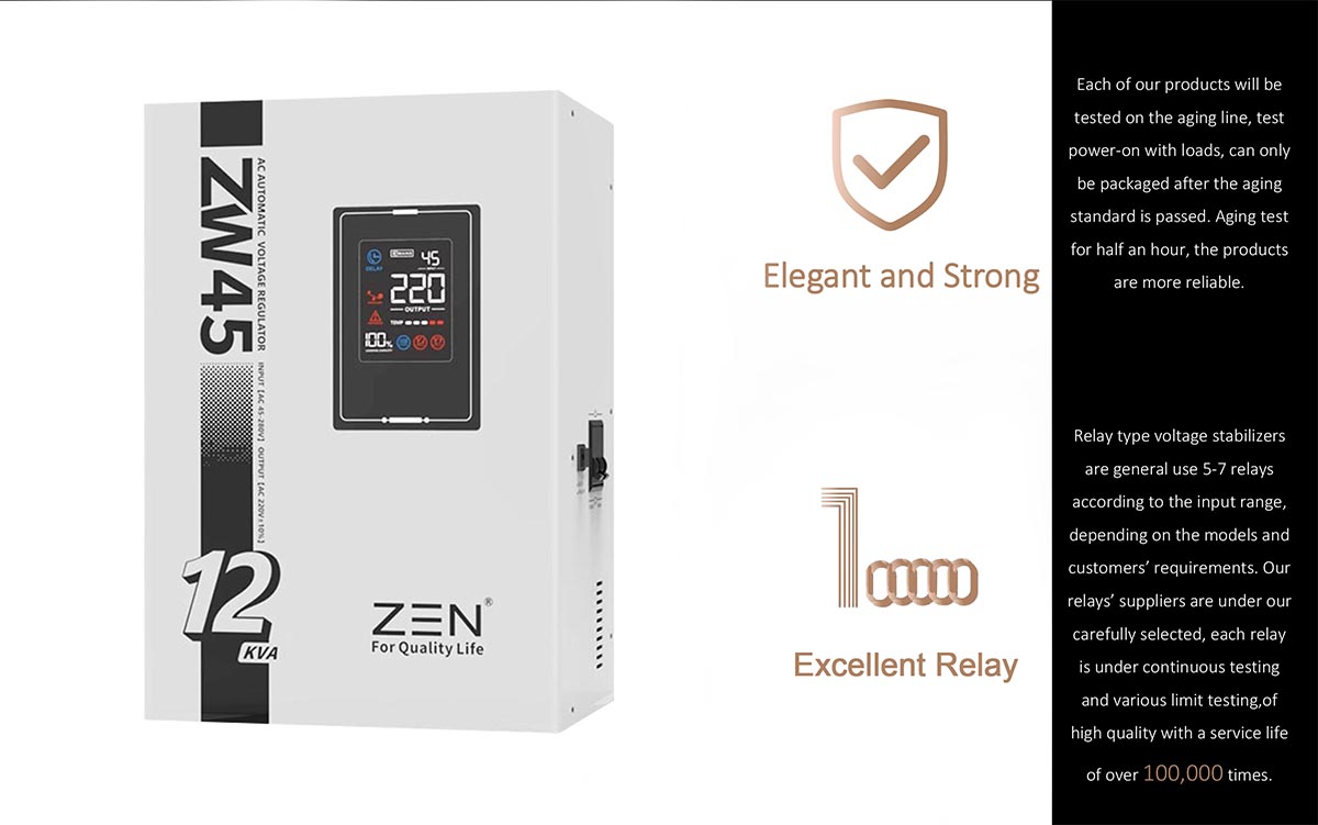 ZEN Machinery brendi Xitoyda ZW45 1KVA dan 30KVA gacha avtomatik AC kuchlanish regulyatorining yetakchi ishlab chiqaruvchisi hisoblanadi. Mahsulot xususiyatlariUshbu model portativ LED raqamli displey uchun mo'ljallangan to'liq avtomatik 220V kichik kuchlanish regulyatoridir. U kichik o'lchamli, engil vaznli, tezkor kuchlanishni sozlash, to'lqin shaklini buzish va boshqalar kabi xususiyatlarga ega.